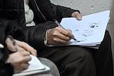Оглашение решения по жалобам на приговор режиссеру Евгении Беркович и драматургу Светлане Петрийчук по делу об оправдании терроризма при постановке пьесы "Финист ясный сокол" в Апелляционном военном суде. Художник делает зарисовки к портретам режиссера Евгении Беркович и драматурга Светланы Петрийчук во время заседания суда.