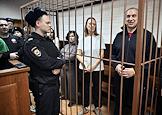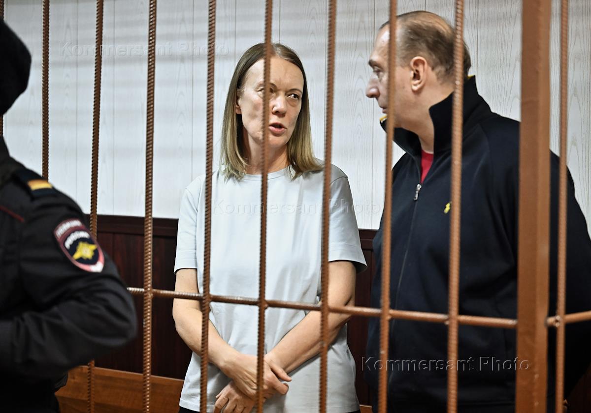 Оглашение приговора бывшему руководителю департамента развития фармацевтической и медицинской промышленности Минпромторга России Ольге Колотиловой, ее заместителю Ольге Покидышевой и другим фигурантам дела о хищении 450 млн рублей, выделенных на реализацию госпрограммы "Фарма-2020", в Таганском районном суде. Бывший руководитель департамента развития фармацевтической и медицинской промышленности Минпромторга России Ольга Колотилова (слева) и бывший президент Федераций водного поло, синхронного плавания и прыжков в воду Алексей Власенко (справа) во время заседания суда.