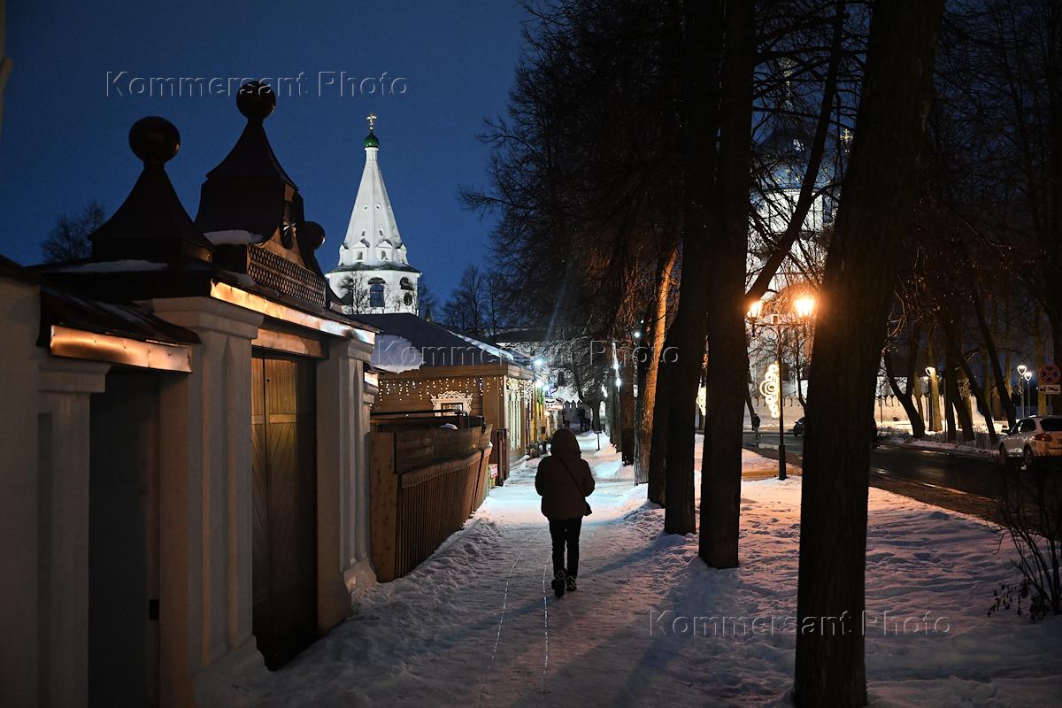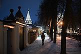 Views of Suzdal. Genre photography. A girl walks along the evening street near the church.