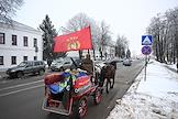 Views of Suzdal. Genre photography. Tourists ride on an old carriage.