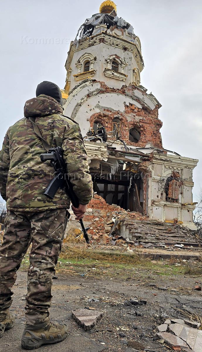 Виды Донецкой Народной Республики. Жанровая фотография. Военный с автоматом на фоне разрушенного храма в поселке Пески.