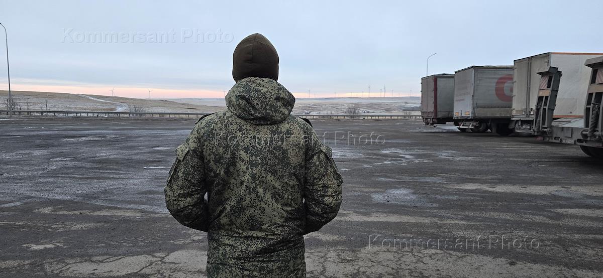 Жанровая фотография. Грузовой военный автомобиль при подъезде к блокпосту.