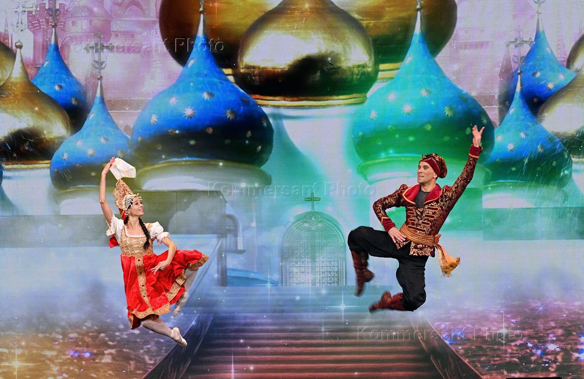 Премьера балета "Щелкунчик" П.И.Чайковского в мультимедийных декорациях в Национальном центре "Россия". Премьер балета Большого театра Игорь Цвирко и ведущая солистка Большого театра Кристина Кретова во время спектакля.