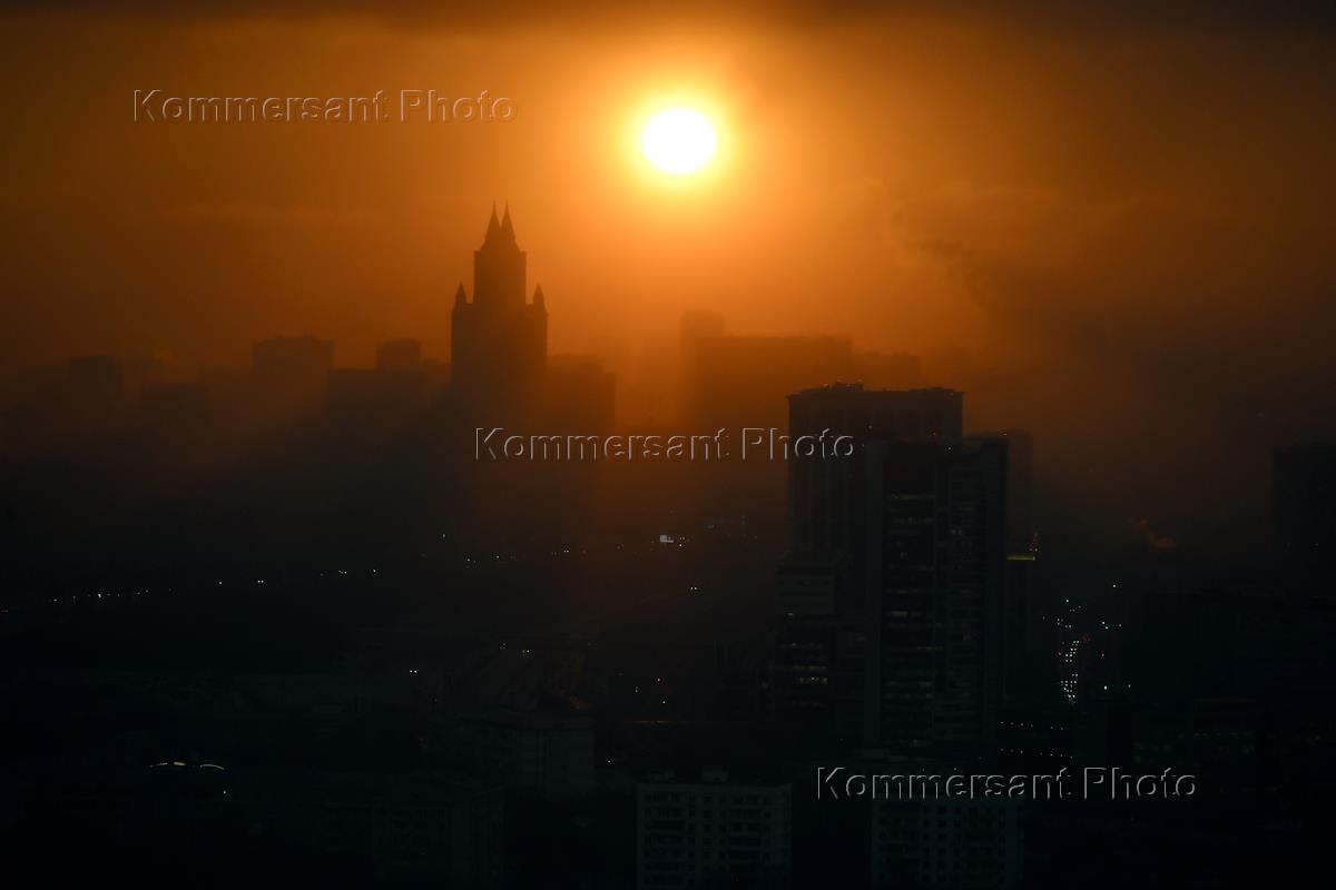Виды Москвы. Жанровая фотография. Дымка над городом во время заката.
