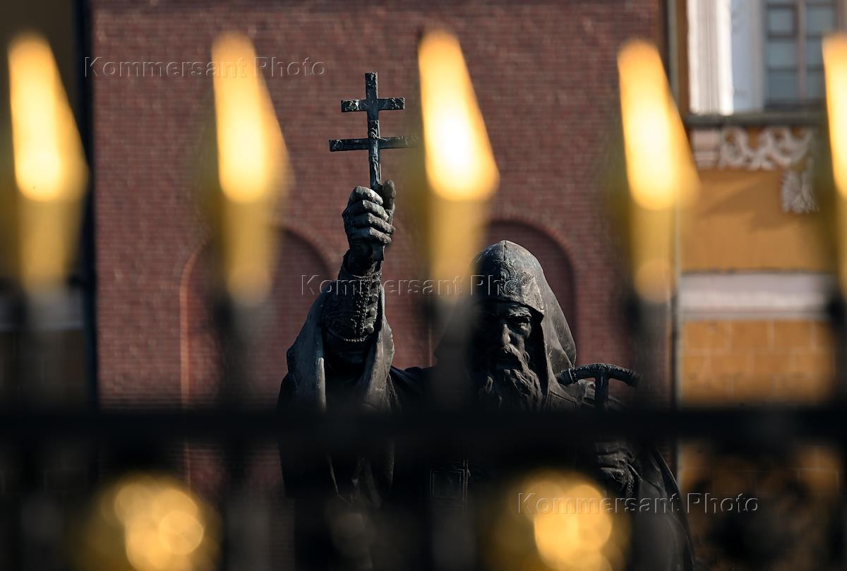 Moscow views. Red Square. Genre photography. Believers at the Cathedral of Our Lady of Kazan.