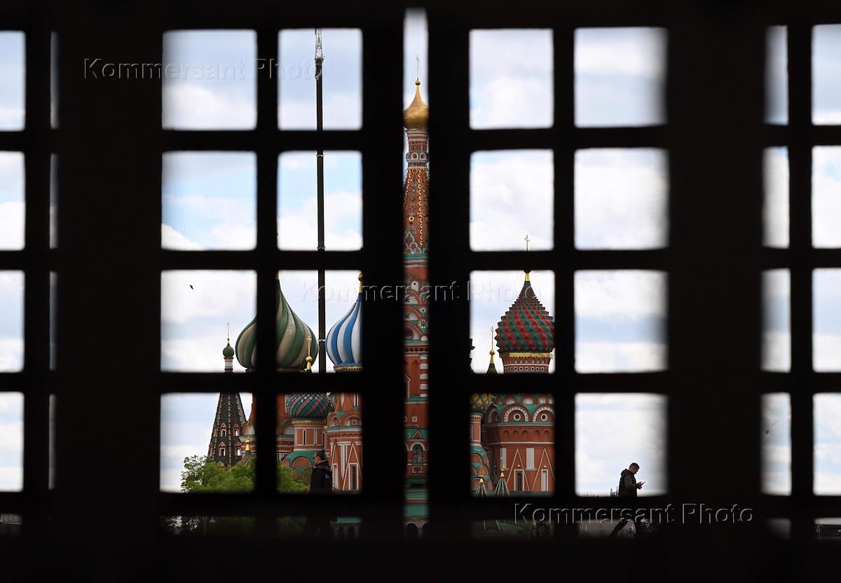 Жанровая фотография. Красная площадь. Люди стоят за ограждением у собора Покрова Пресвятой Богородицы, что на Рву (храм Василия Блаженного).