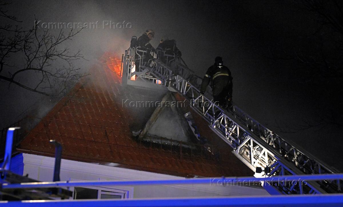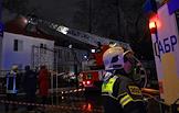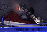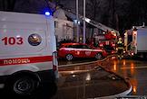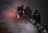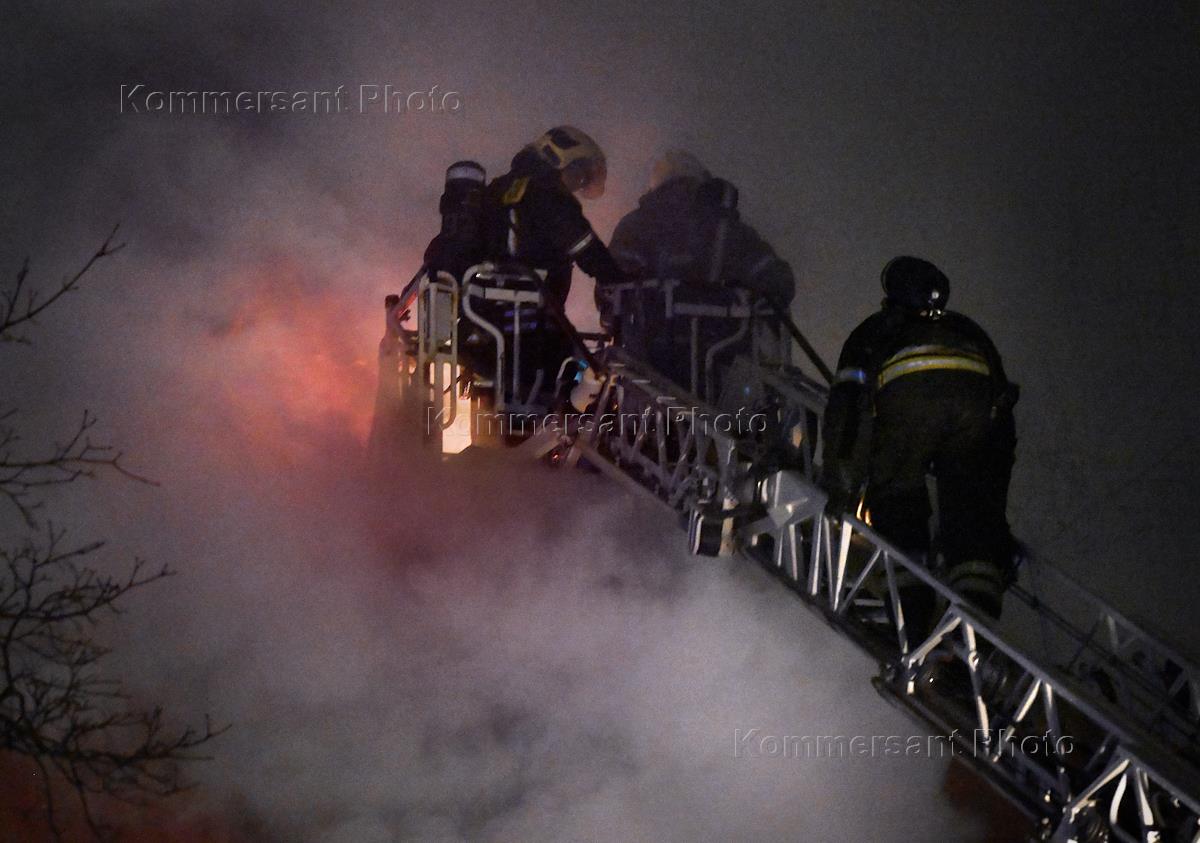 Пожар в Церкви Иисуса Христа Святых последних дней (мормонская церковь) на улице Врубеля, дом 1. Пожарный МЧС России во время ликвидации пожара.