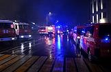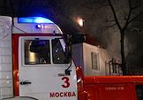 Пожар в Церкви Иисуса Христа Святых последних дней (мормонская церковь) на улице Врубеля, дом 1. Автомобили пожарной части МЧС России на месте происшествия.