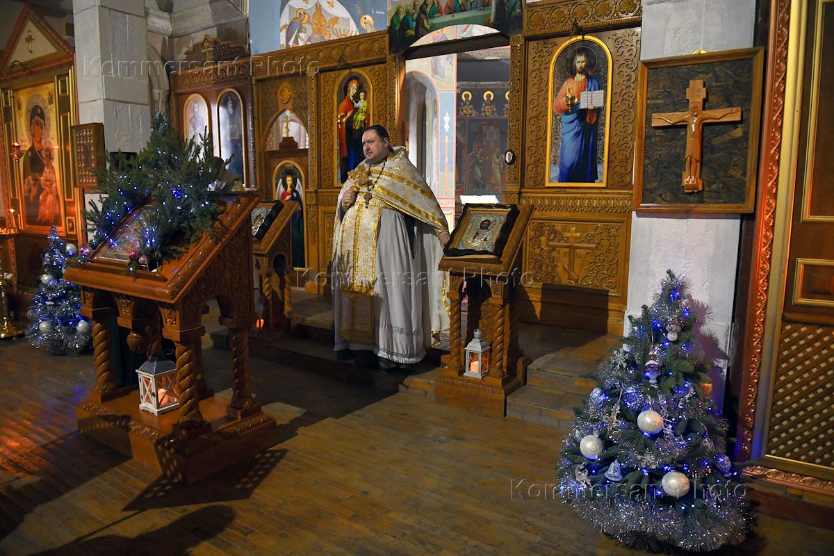 Рождественское богослужение в Свято-Иверском женском монастыре. Священнослужитель во время богослужения.