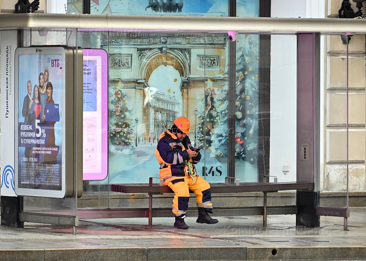 Жанровая фотография. Сотрудник коммунальной службы города во время отдыха на остановке общественного транспорта.