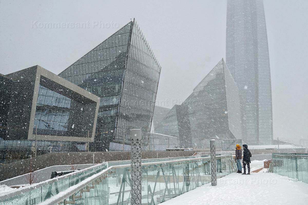 Жанровая фотография. Вид на бизнес-центр "Лахта Центр" во время метели.