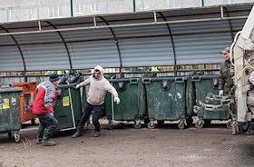 Жанровая фотография. Сотрудники ЖКХ на площадке для контейнеров по сбору мусора.