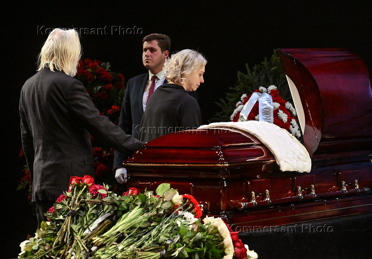 Церемония прощания с актрисой Евгенией Добровольской в МХТ имени Чехова. Сын Евгении Добровольской, актер Николай Ефремов (слева) и главный режиссер Российского академического молодежного театра Марина Брусникина (вторая слева) во время церемонии.