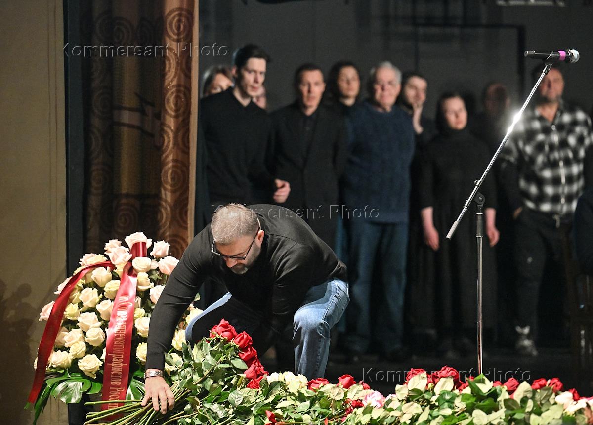 Церемония прощания с актрисой Евгенией Добровольской в МХТ имени Чехова. Продюсер Ренат Давлетьяров (в центре) во время церемонии.