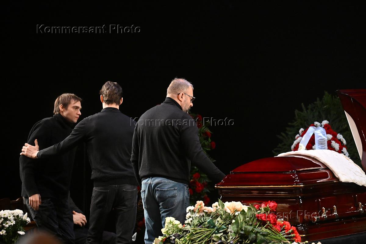 Церемония прощания с актрисой Евгенией Добровольской в МХТ имени Чехова. Продюсер Ренат Давлетьяров (в центре) во время церемонии.