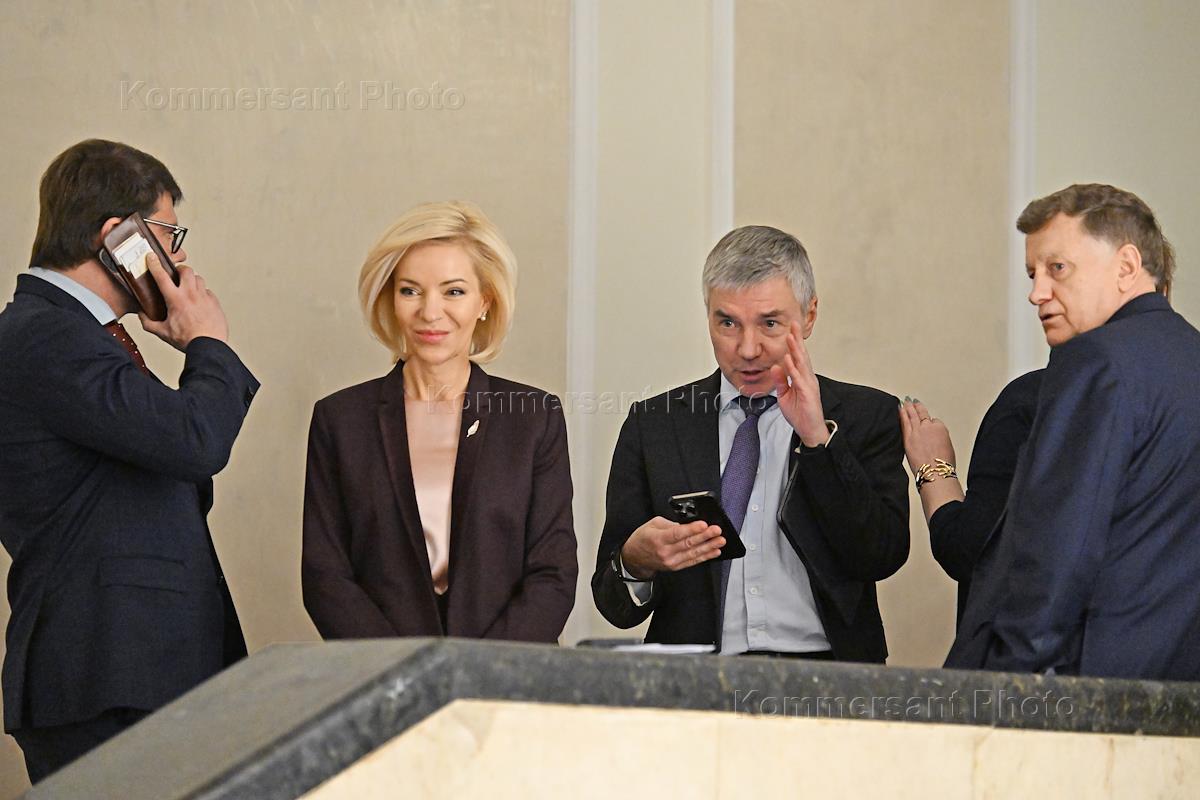 Первое пленарное заседание весенней сессии Государственной думы (ГД) России. Слева направо: председатель комитета ГД России по безопасности и противодействию коррупции Василий Пискарев, председатель комитета ГД России по культуре Ольга Казакова, председатель комитета ГД России по информационной политике, информационным технологиям и связи Сергей Боярский и член комитета ГД России по государственному строительству и законодательству Дмитрий Вяткин перед началом заседания.