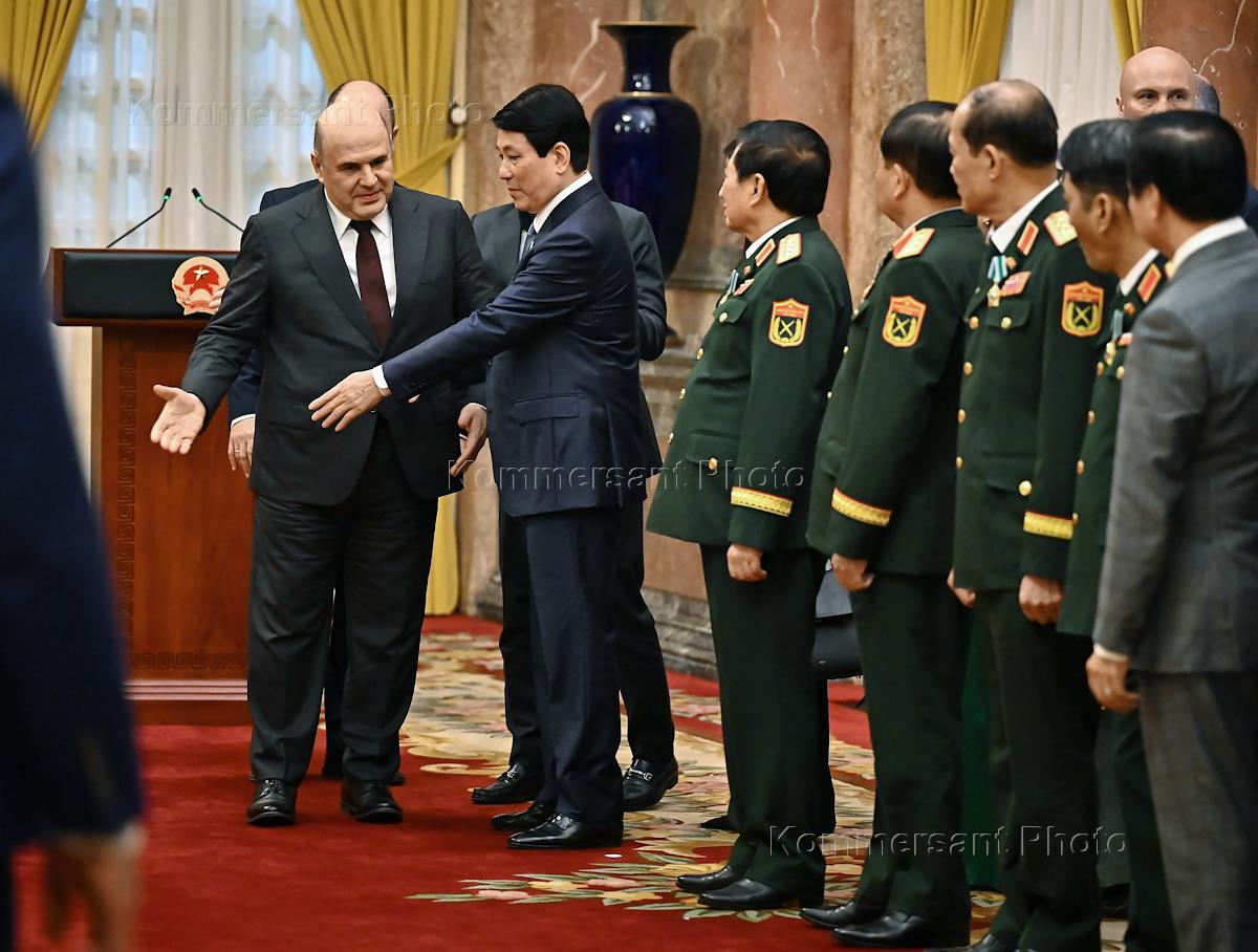 Working trip of Russian Prime Minister Mikhail Mishustin to Vietnam. Ceremony of presenting Russian state awards to Vietnamese officials. Russian Prime Minister Mikhail Mishustin (left) and Vietnamese President Luong Cuong (right) during the ceremony.