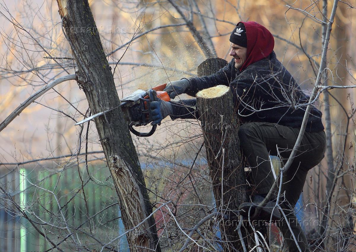 Genre photography. A city utility worker cutting down dead trees.