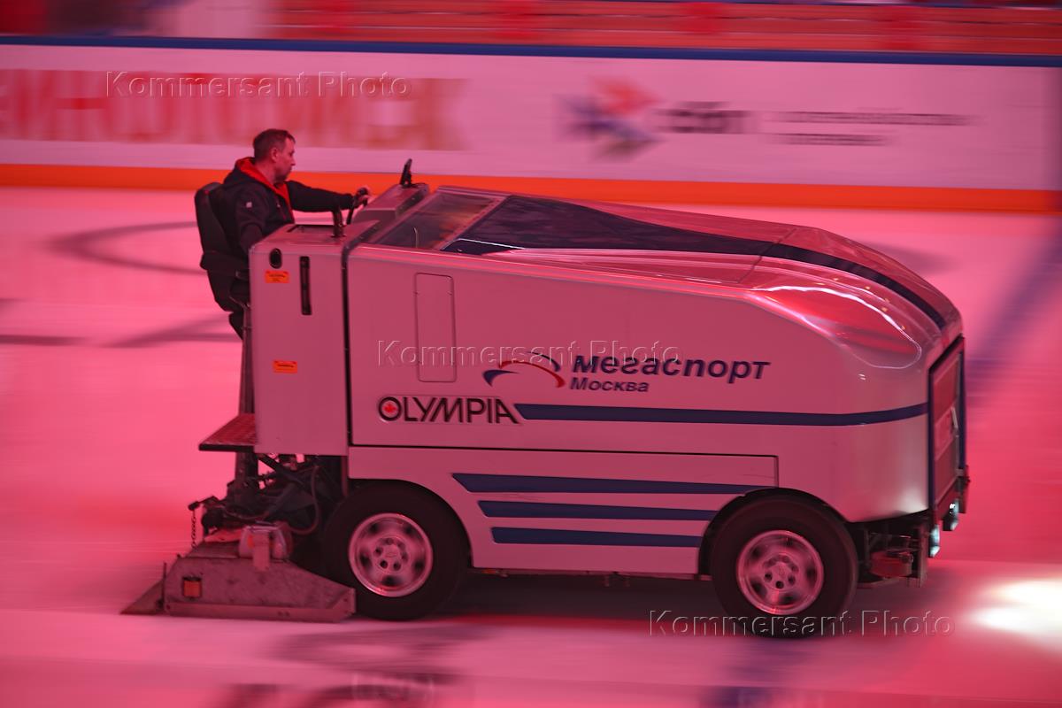 Kontinental Hockey League (KHL). Championship season 2024/25. Match between the teams "Spartak" (Moscow) - "Avtomobilist" (Ekaterinburg) at the Megasport Sports Palace. Genre photography. Preparing the ice arena for a hockey match.
