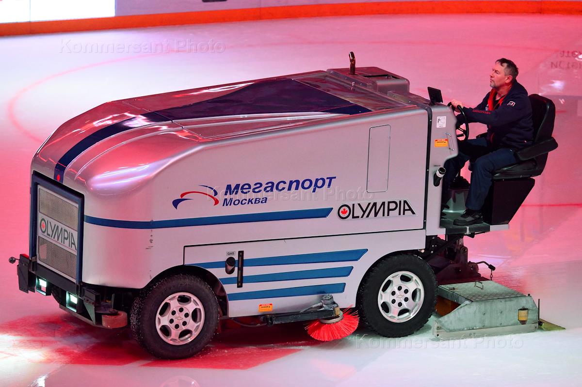 Континентальная хоккейная лига (КХЛ). Чемпионат сезона 2024/25. Матч между командами "Спартак" (Москва) - "Автомобилист" (Екатеринбург) во Дворце спорта "Мегаспорт". Жанровая фотография. Подготовка ледовой арены к хоккейному матчу.