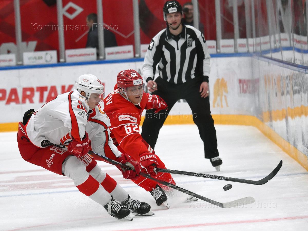 Континентальная хоккейная лига (КХЛ). Чемпионат сезона 2024/25. Матч между командами "Спартак" (Москва) - "Автомобилист" (Екатеринбург) во Дворце спорта "Мегаспорт". Игроки команды "Спартак" Адам Ружичка (слева) и Егор Филин (справа) во время матча.