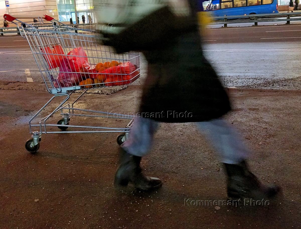 Genre photography. A supermarket trolley with groceries stands on the side of the road.