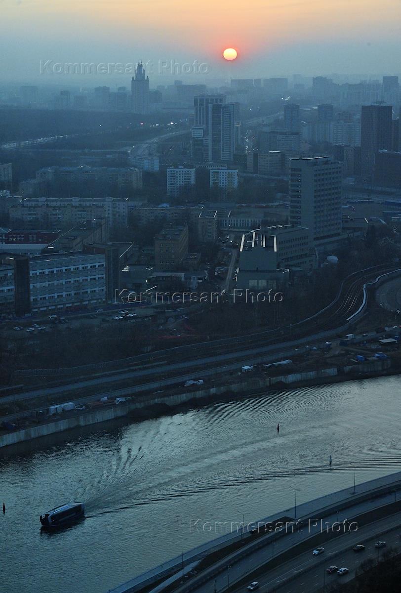 Moscow evening views from an airplane window. Genre photography.
