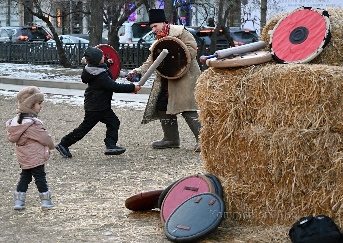 Genre photography. Children on the site of the Moscow Maslenitsa festival during a play reconstruction of a sword fight.