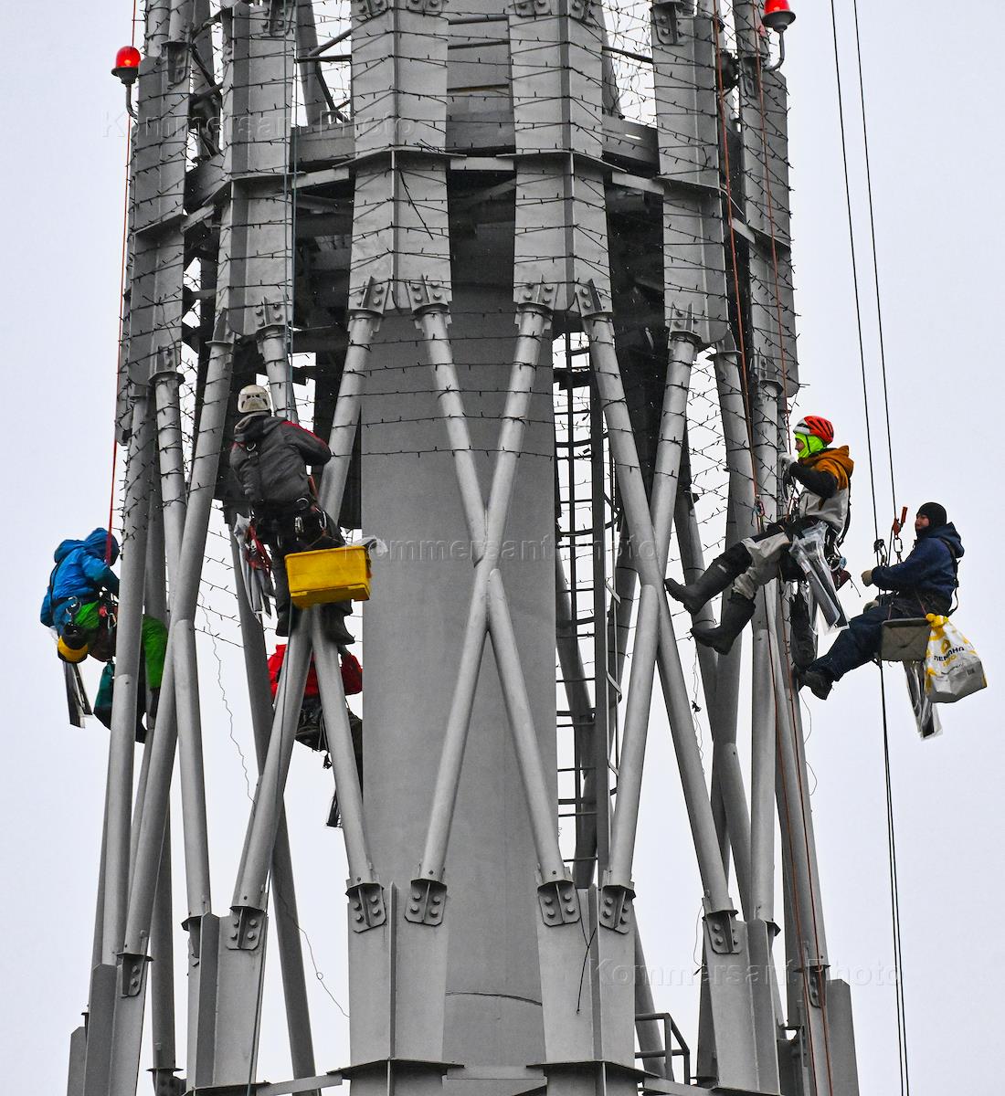 Genre photography. Preparations for New Year's celebrations in the city. Installation of New Year's light decorations on the tower.