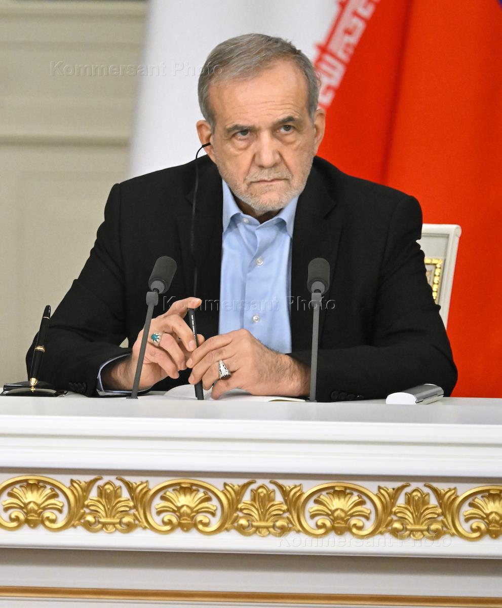 Встреча президента России Владимира Путина и президента Ирана Масуда Пезешкиана в Кремле. Президент Ирана Масуд Пезешкиан (слева) и президент России Владимир Путин (справа) во время выступления с заявлением для прессы после церемонии подписания договора о всеобъемлющем стратегическом партнерстве между Россией и Ираном.
