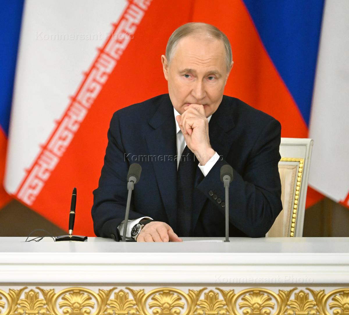 Встреча президента России Владимира Путина и президента Ирана Масуда Пезешкиана в Кремле. Президент России Владимир Путин во время выступления с заявлением для прессы после церемонии подписания договора о всеобъемлющем стратегическом партнерстве между Россией и Ираном.