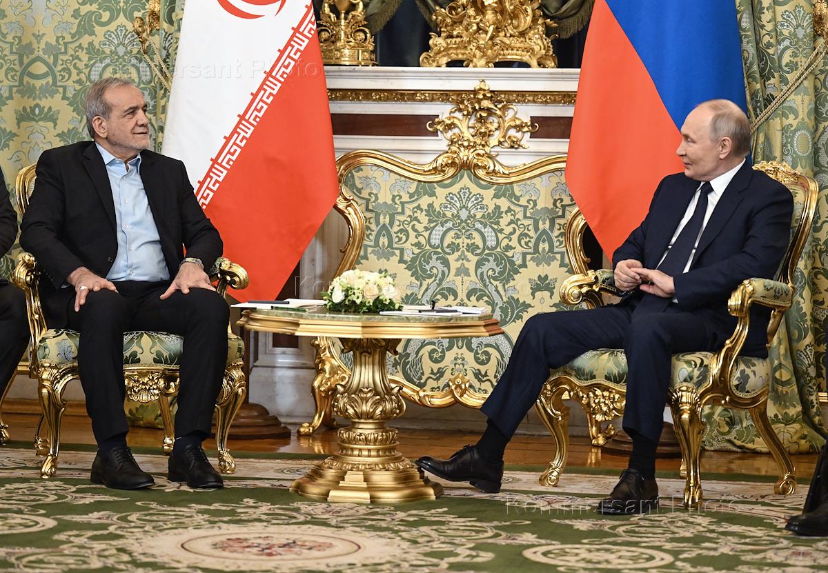 Встреча президента России Владимира Путина и президента Ирана Масуда Пезешкиана в Большом Кремлевском дворце. Президент России Владимир Путин (слева) и президент Ирана Масуд Пезешкиан (справа) во время встречи.