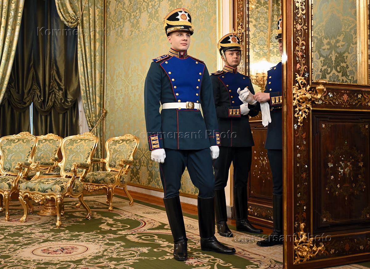 Встреча президента России Владимира Путина и президента Ирана Масуда Пезешкиана в Большом Кремлевском дворце. Военнослужащие президентского полка перед началом встречи.
