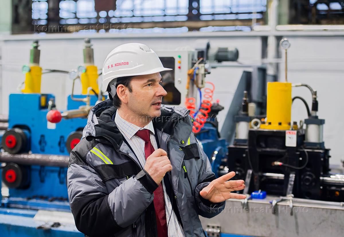 Ceremony of the ceremonial launch of new modern high-tech equipment for turning rolled metal at JSC Metallurgical Plant Petrostal. CEO of JSC Metallurgical Plant Petrostal Vasily Khokhlov during the ceremony.