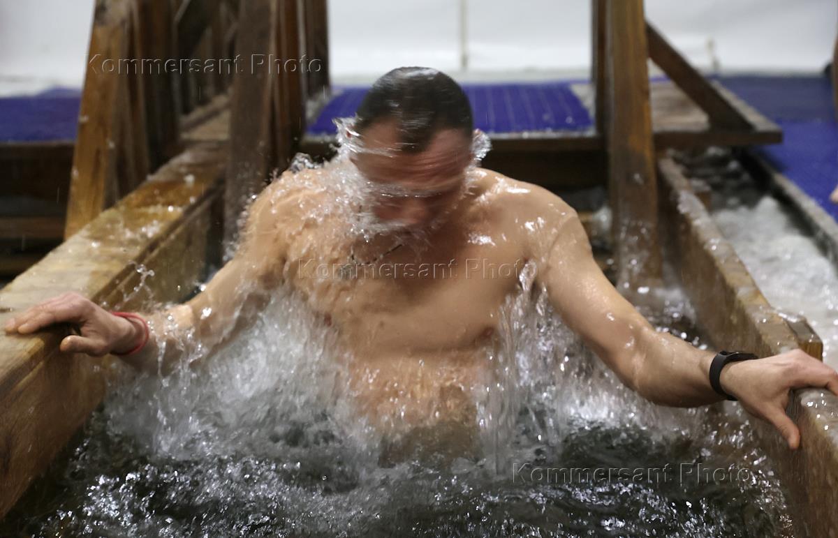 Праздник Крещения Господня (Богоявления). Верующие во время крещенских купаний в проруби пруда у отеля Ramada ("Рамада").