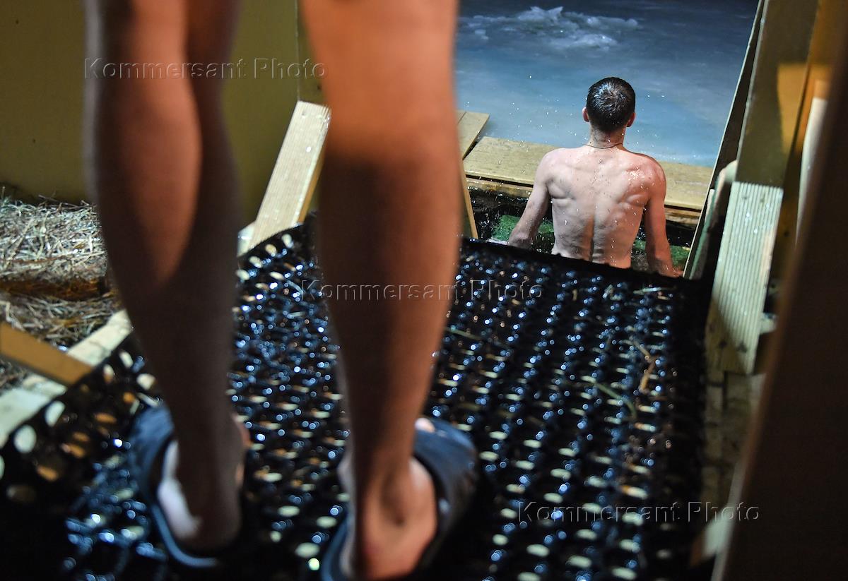 The Feast of the Epiphany. Believers during Epiphany bathing on the Neva near the Church of the Dormition of the Blessed Virgin Mary.