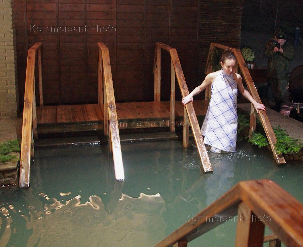 Feast of the Epiphany. Believers during Epiphany bathing in the font on the territory of the Church of St. George the Victorious - the main church of the Southern Military District.