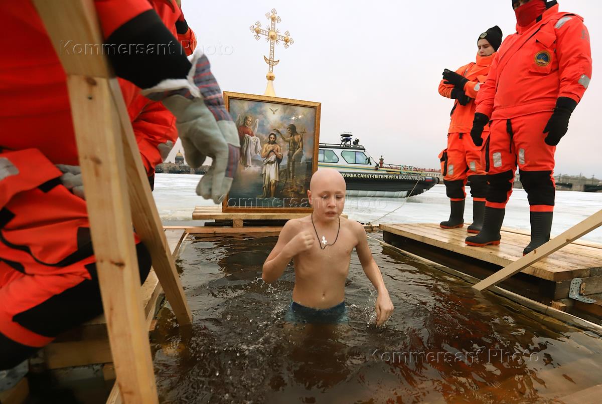 Праздник Богоявления (Крещения) Господня. Верующие во время крещенских купаний в проруби на стрелке Заячьего острова.