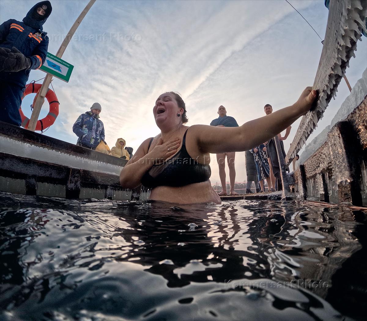 Праздник Крещения Господня (Богоявления). Верующие во время крещенских купаний в протоке реки Обь, микрорайон "Европейский берег".