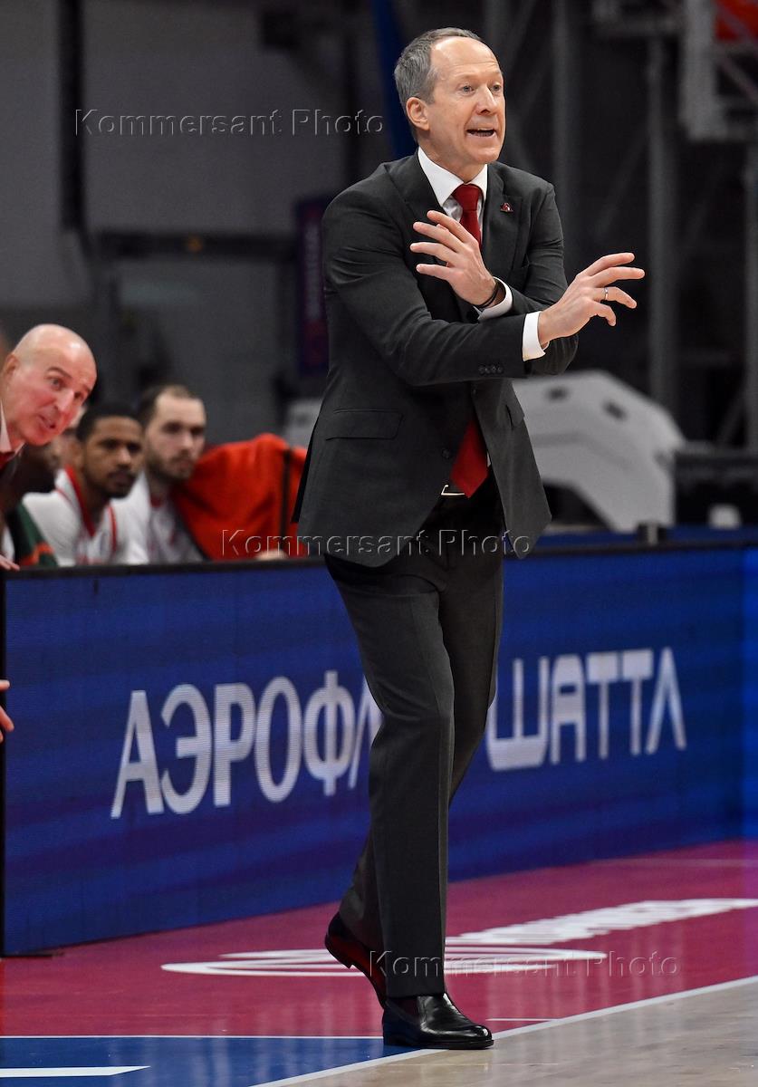 Единая лига ВТБ 2024/2025. Баскетбол. Матч между командами ЦСКА (Москва) и "Локомотив-Кубань" (Краснодар) на стадионе "Мегаспорт". Главный тренер команды ЦСКА Андреас Пистиолис (в центре) во время матча.
