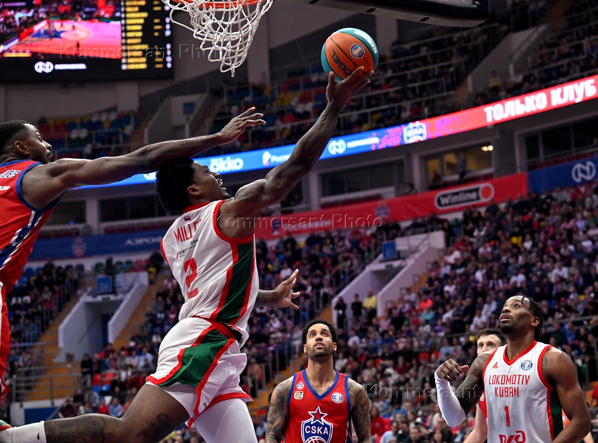 Единая лига ВТБ 2024/2025. Баскетбол. Матч между командами ЦСКА (Москва) и "Локомотив-Кубань" (Краснодар) на стадионе "Мегаспорт". Жанровая фотография.