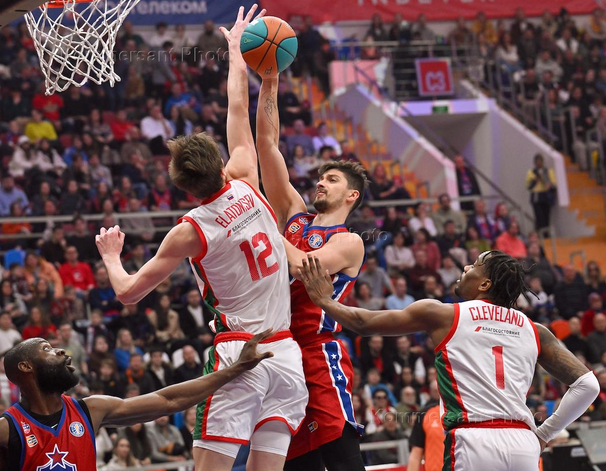 VTB United League 2024/2025. Basketball. Match between the teams CSKA (Moscow) and "Lokomotiv-Kuban" (Krasnodar) at the Megasport stadium. Genre photography.