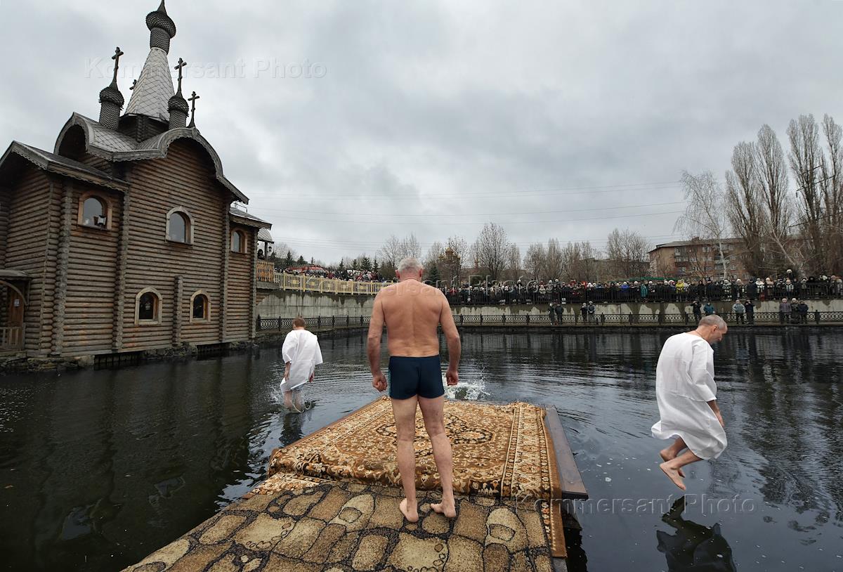 Feast of the Epiphany. Epiphany bathing in the font in the St. George Parish.