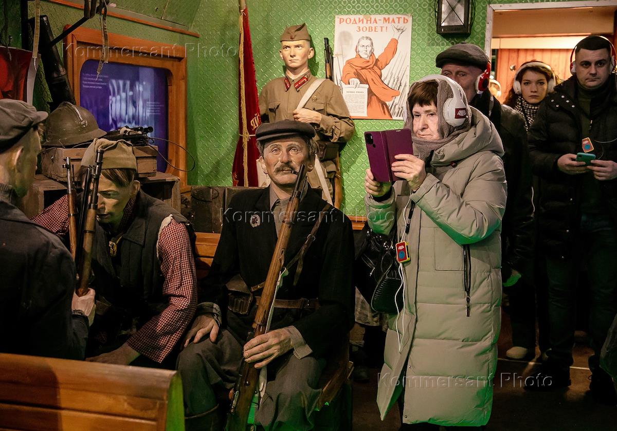 Immersive exhibition "Victory Train" at the Vitebsk railway station dedicated to the 80th anniversary of the Victory. Visitors at the exhibition.