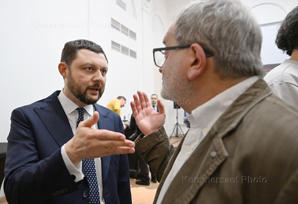 Opening ceremony of the joint project of the Moscow Museum of Modern Art (MMOMA) and the Russian Jewish Congress in memory of the victims of the Holocaust "Saviors. Paths of Salvation" at MMOMA. Journalist, cultural scientist Anatoly Golubovsky (right) and MMOMA executive officer Vasily Tsereteli (left) at the ceremony.