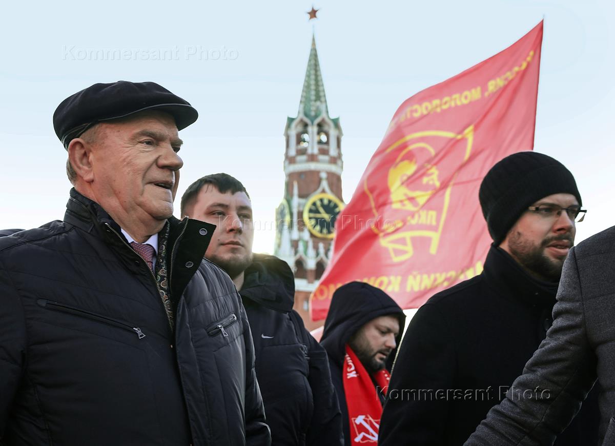 Flower-laying ceremony at the Lenin's Mausoleum at Red Square on the day of remembrance of revolutionary leader Vladimir Lenin. Leader of the Communist Party of the Russian Federation, head of the Communist Party faction in the State Duma of Russia Gennady Zyuganov (center), Chairman of the Russian State Duma Committee on Agrarian Issues Vladimir Kashin (second from right) and Chairman of the Russian State Duma Committee on the Development of the Far East and Arctic Nikolai Kharitonov (right) at the ceremony.