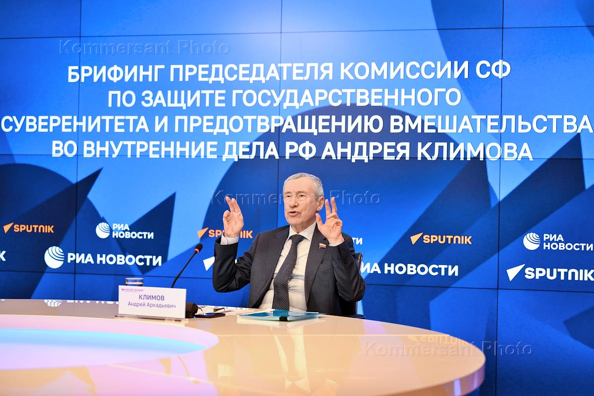 Briefing by the Chairman of the Commission of the Russian Federation Council on protecting state sovereignty and preventing interference in the internal affairs of Russia Andrei Klimov at the International Media Group "Russia Today".