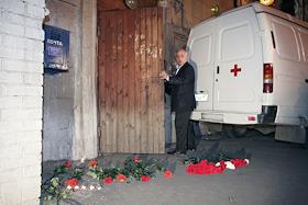 Обозреватель "Новой газеты" Анна Политковская была убита из огнестрельного оружия в подъезде собственного дома около 16.30 мск. Работа следственной группы на месте убийства Анны Политковской. Цветы у входа в подъезд.