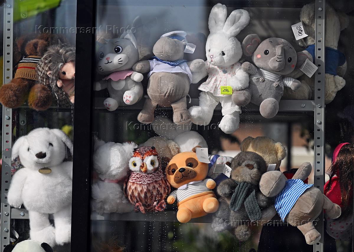 Genre photography. Showcase with soft toys.