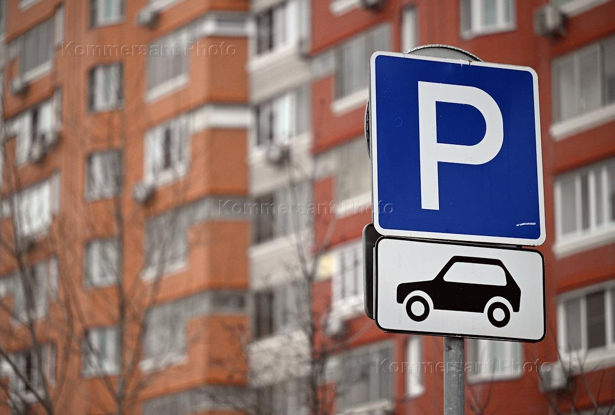 Views of Moscow. Genre photography. Parking road sign against the background of new buildings.